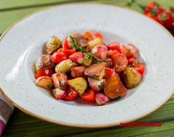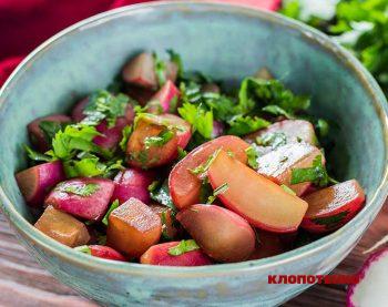 Зізнавайтесь, запікали колись редиску? Насправді цей овоч чудово смакує після термічної обробки, тож не бійтесь експериментувати та готувати його по-різному. Ми пропонуємо зробити салат з редисом та молодою картоплею, додавши до нього соковиті томати чері та листя чебрецю. Поєднання сміливе, але точно не залишить вас байдужими, а надто ваших гостей, якщо готуватимете на свято.