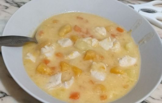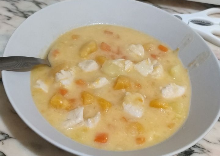 Поріжте великим кубиком 500 г філе стегна курки. Почистіть та поріжте кубиком 400-500 г картоплі, 1 моркву, 300 г гарбуза та 1 цибулю.