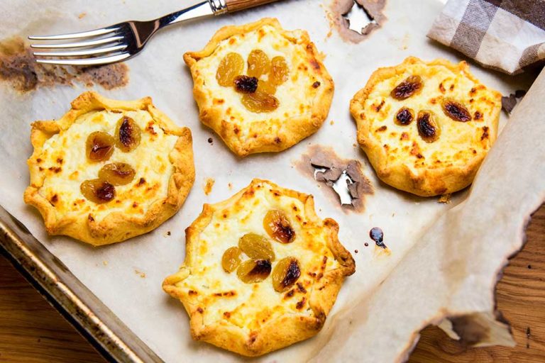 Для тіста змішайте 180 г холодного масла, натертого на велику тертку, 1 яйце, 1 жовток, 3 ст. л. молока, 350 г борошна, 1 ст. л. цукру та дрібку солі. Замісіть тісто. Заверніть тісто у харчову плівку та дайте відпочити у холодильнику протягом 15-20 хвилин.
