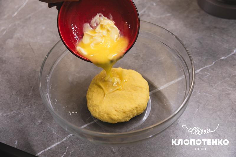 Вмішайте в тісто 90 г мʼякого масла та продовжуйте вимішувати тісто ще 10-15 хвилин.