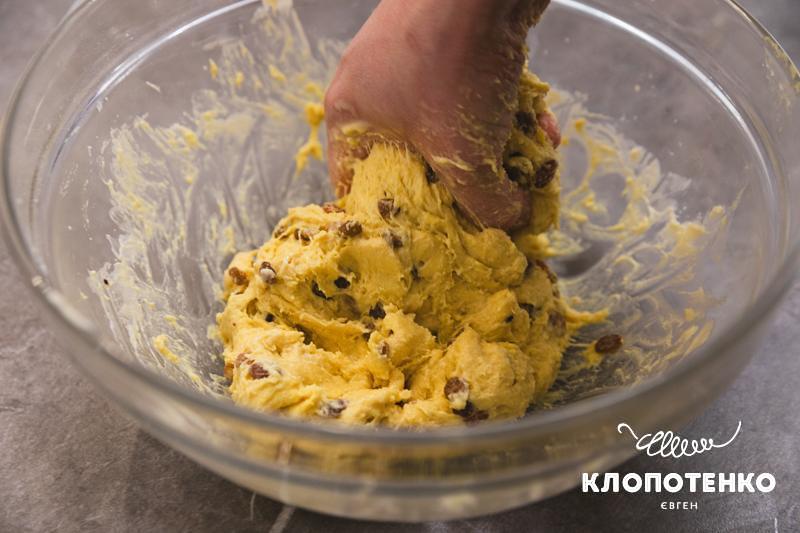 Промийте окропом родзинки, промокніть їх паперовим рушником і вмішайте в тісто. Складіть тісто в тарілку та накрийте чистим рушником. Залиште тісто підходити на 40-50 хвилин.