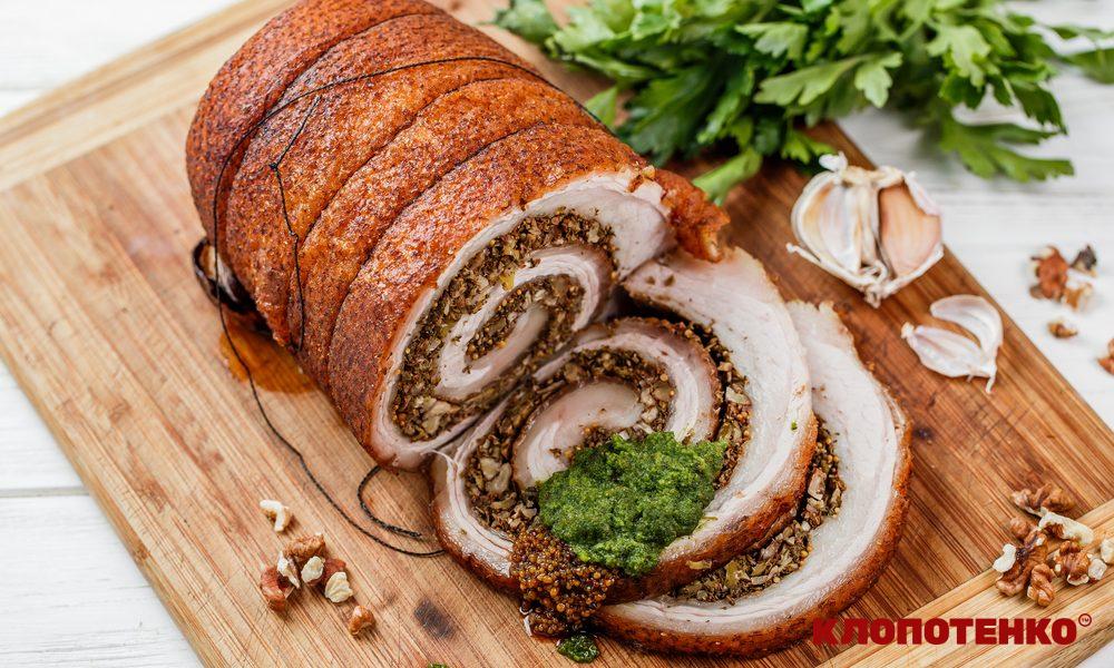 Поркета – одна з традиційних страв Італії, яка готується із запеченої свинини, головним чином – сала з м’ясним прошарком. Жодне святкування не обходиться в Італії без цих ласощів. Поркета – страва досить калорійна, тому я вирішив трохи відтінити її смак за допомогою зеленого соусу на основі петрушки і лимонного соку. Повірте, апетитна скоринка і ніжний смак запеченого генеральського сала зі спеціями неодмінно прийдеться вам до душі.