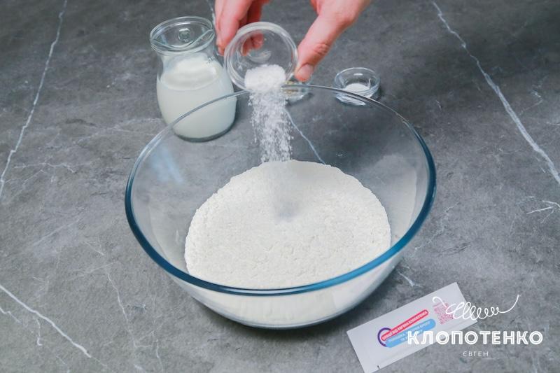 Увімкніть духовку розігріватися до 200 градусів. У чималу миску викладіть 500 г борошна, 400 мл кефіру, по ½ ч.л. розпушувача та солі, суміш спецій “ромашка, кріп, коріандр”.