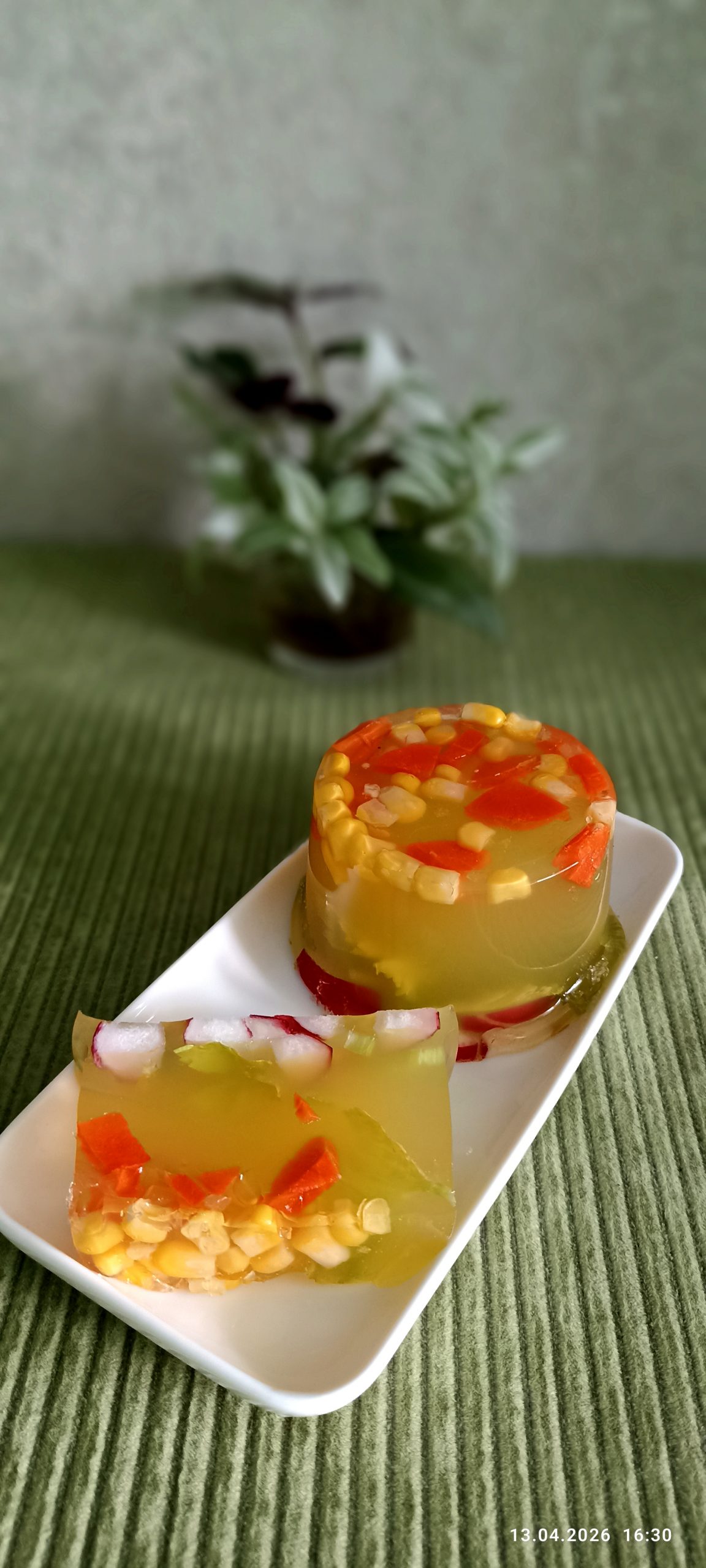 Готовий овочевий бульйон зніміть з вогню та процідіть через сито або марлю. додайте до нього набухлий желатин і добре перемішайте до повного розчинення.