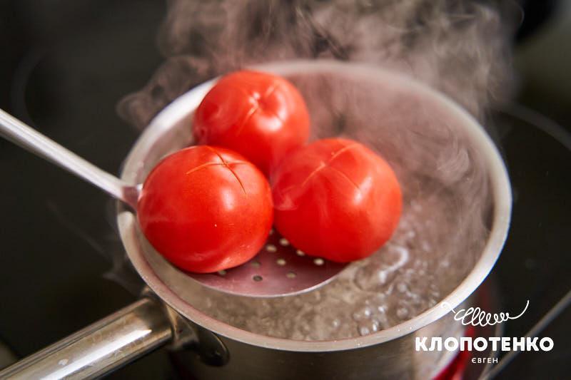 Пробланшуйте томати: зробіть неглибокі надрізи хрест-навхрест, залийте їх окропом на 1 хвилину та зніміть шкірку. Наріжте томати кубиком.