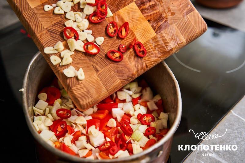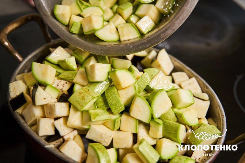 Промийте та наріжте кубиком 1,1 кг кабачків, 1,1 кг баклажанів, 2 перці та 2 цибулини. Гострий перець наріжте кружечками. Головку часнику очистьте та наріжте слайсами.