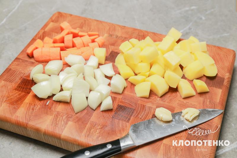 Почистьте та поріжте на великі четвертинки 2 цибулі, 1 моркву, 2 великих штуки картоплі. Почистьте та роздушіть ножем 2 зубчики часнику.