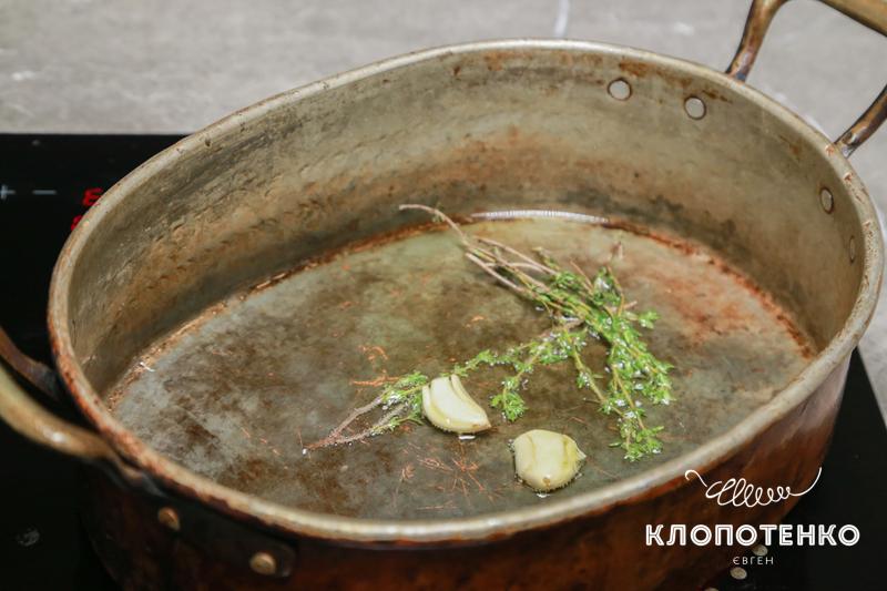 Додайте на розпечену пательню 2 ст. л. олії, часник та 2 гілочки свіжого чебрецю. Смажте 30 секунд, дістаньте чебрець з часником.