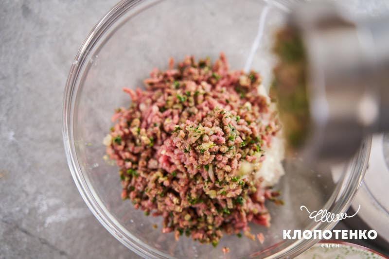 У м’ясорубці перекрутіть 500 г яловичого фаршу, по 50 г петрушки та кінзи, 150-200 г цибулі та 3 зубчики часнику.