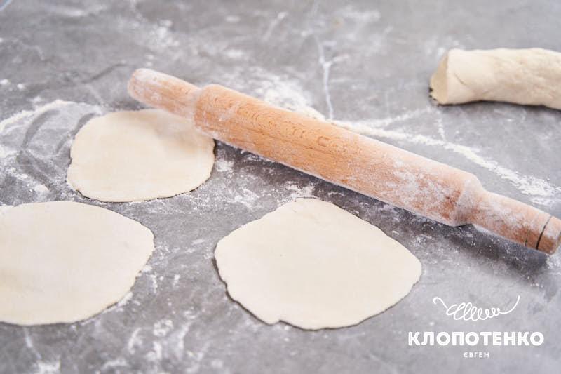 У цей час дістаньте тісто з холодильника, припиліть поверхню борошном та розкачайте його товщиною пару міліметрів. Розділіть на кружальця по 13-15 см в діаметрі.