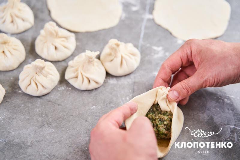 У кожне кружальце викладіть по 1 ст.л. начинки без гірки (приблизно 25 г). Сформуйте хінкалі, заліплюючи тісто складками до верхівки. Майстерність кулінара часто визначається кількістю складок. В ідеалі їх має бути десь 19, однак 10-12 цілком достатньо.