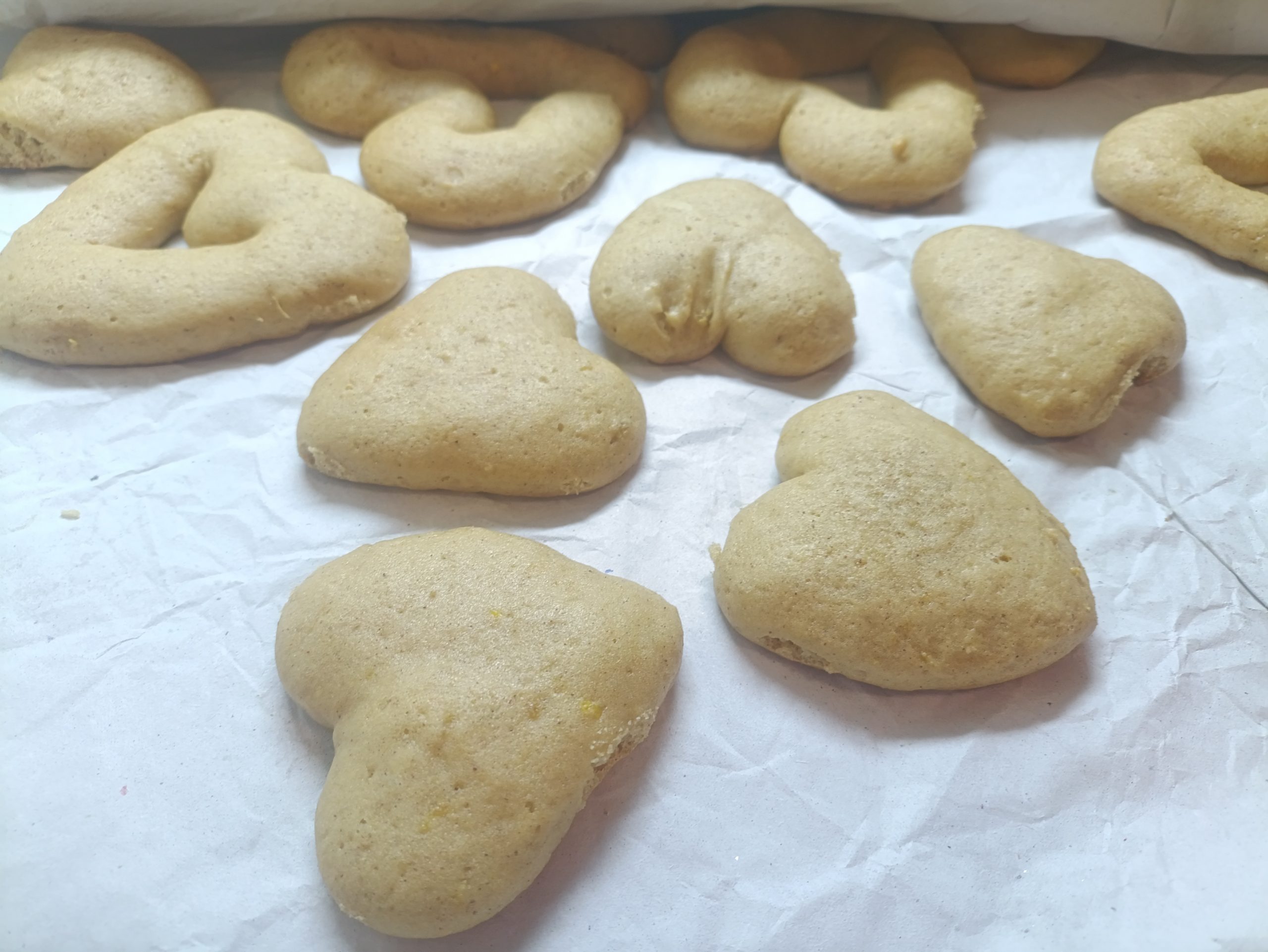 Для меренги на паровій бані збийте 2 яєчних білки, 100 г цукру та 1 ч. л. лимонного соку. Збивайте, поки маса не загусне. Викладіть меренгу у кондитерський мішок та прикрасьте готове печиво. Дайте мерензі застити та подавайте до столу. Нехай смакує!