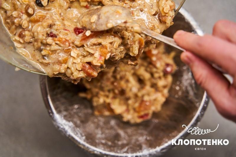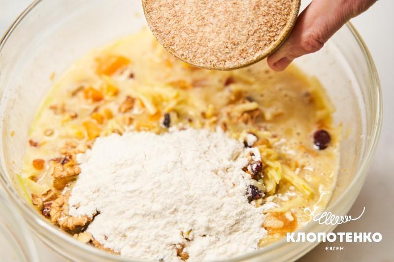 Збийте до однорідного стану 3 яйця зі 100 г цукру та 1 ст. л меду. Розтопіть і остудіть 100 г масла, перемішайте його з сухофруктами і яєчною масою, додайте 50 г горіхів, очищене і потерте на дрібній тертці яблуко та знову все перемішайте.
