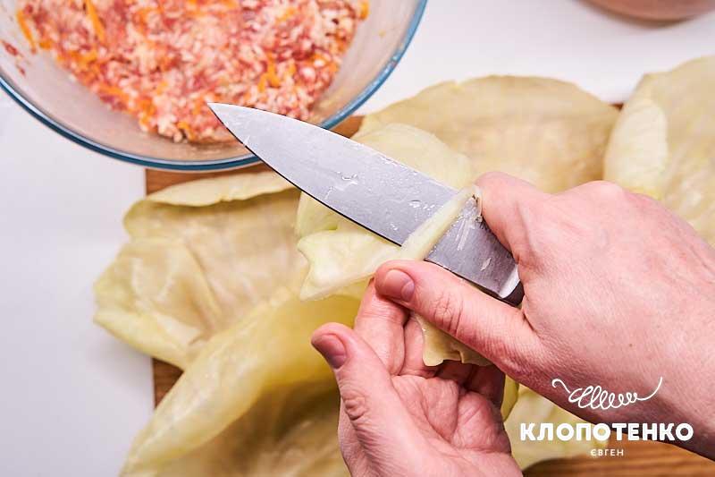 Отрежьте с каждого листика капусты жесткую часть. Тогда готовые голубцы будут более нежными по вкусу.