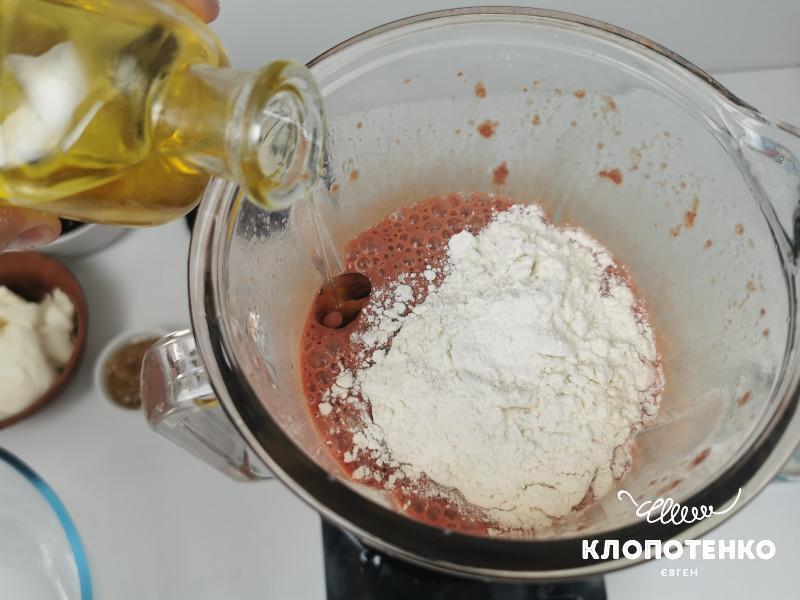 Добавьте 2 яйца, 3 ст. л. пшеничной муки, влейте 150 мл молока 2,5% и 2 ст. л. подсолнечного масла. Посолите и поперчите по вкусу. Снова хорошо перебейте.