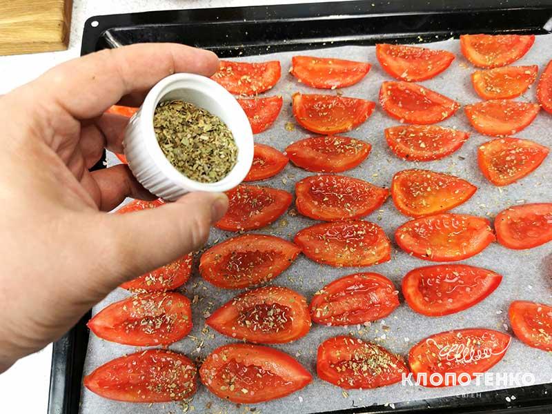 Выложите четвертинки томатов на противень, застеленный пергаментом, верх срезом. Посыпьте по вкусу морской солью и 1 ч. л. сухого орегано. Сушите в духовке с температурой 70-75 градусов в течение 5-6 часов. Для того чтобы избежать чрезмерного скопления влажности в духовке, периодически открывайте ее для вентиляции или вставьте деревянную палочку для суши в верхней части дверцы духовки, чтобы лишняя влага выходила постоянно.