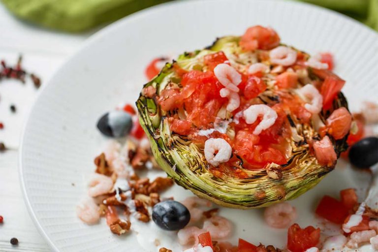 Летние рецептыСалат из обжаренной молодой капусты с креветками