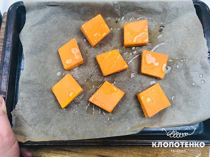200 г гарбуза очистьте від шкірки та наріжте великими кубиками. Викладіть їх на застелене пергаментом деко і збризніть оливковою олією. 1 зубчик часнику очистьте від лушпиння, натріть на дрібній терці та посипте ним гарбуз. Запікайте у розігрітій до 200 градусів духовці доки гарбуз не стане м'яким.