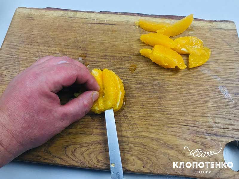 За допомогою дрібної терки, зніміть цедру з апельсина. Потім виріжте з нього філе. Для цього потрібно очистити апельсин від шкірки та, за допомогою гострого ножа, вирізати м'якуш між плівок.