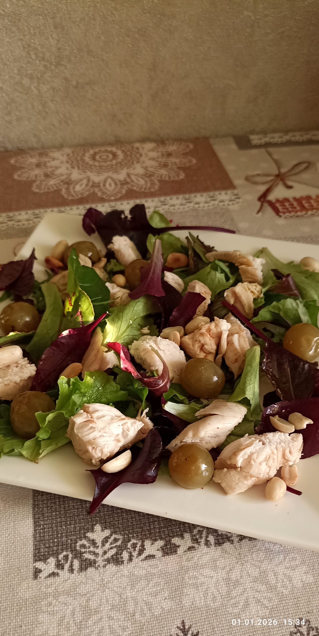 Викладіть на тарілку 50 г міксу салату, курку та виноград.