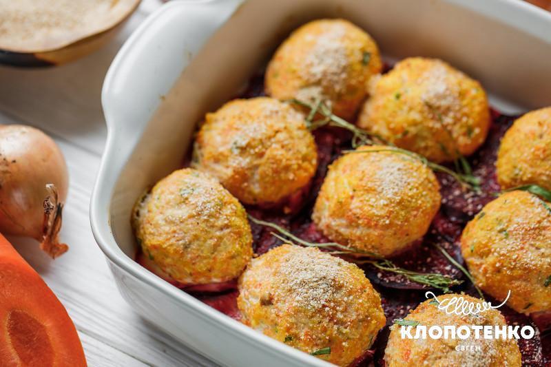 Добре перемішайте рибний фарш і сформуйте великі кульки. У нас вийшло 9 фішболів. Викладіть їх у форму на слайси буряка.