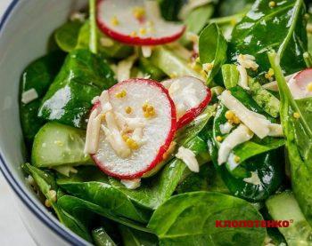 Класичні весняні салати легко урізноманітнити, додавши нові інгредієнти. У цьому варіанті поєднуються шпинат, огірок і редиска, а твердий сир робить страву більш виразною. Для заправки підійде олія з гірчицею та оцтом або легкий медово-гірчичний соус.