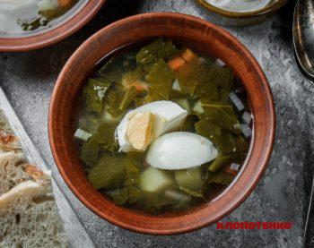 Класичний зелений борщ зі щавлем і свининою. Він виходить наваристим з легкою кислинкою та насиченим смаком. Готується на м’ясному бульйоні, подається з вареним яйцем і сметаною. Добре настоюється і стає ще смачнішим наступного дня.