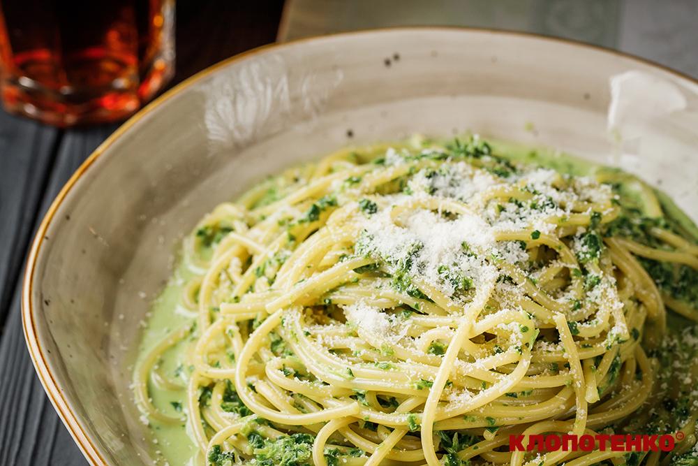 Ситна паста зі шпинатом у вершковому соусі. Страва готується швидко і має ніжну кремову текстуру. Шпинат додає свіжості та легкого смаку. Добре підходить для обіду в будні.