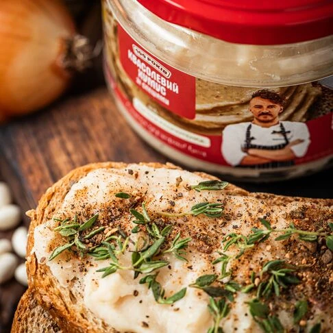 Квасолевий хумус чи, простіше кажучи, квасолевий паштет з квасолі сорту «Яська», який вирощує одна родина на Заході України вже більше 100РОКІВ. В цій квасолі на 20% більше білків у порівнянні зі звичайною. Технологія проста, квасолю замочують, відварюють та перебивають з олією та спеціями, зокрема коріандром, тож хумус виходить дещо пікантний та пряний. Такий собі крем-чіз, тільки квасолевий.
