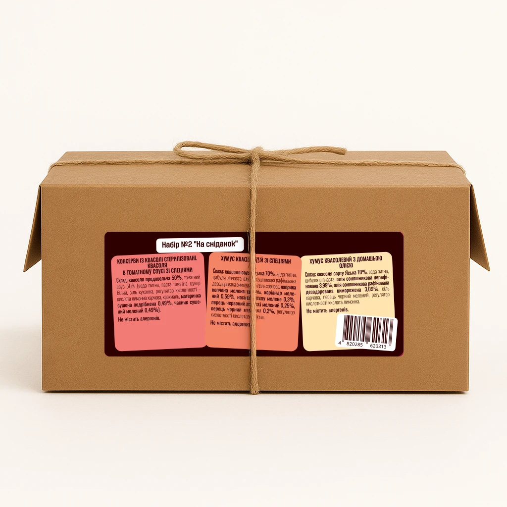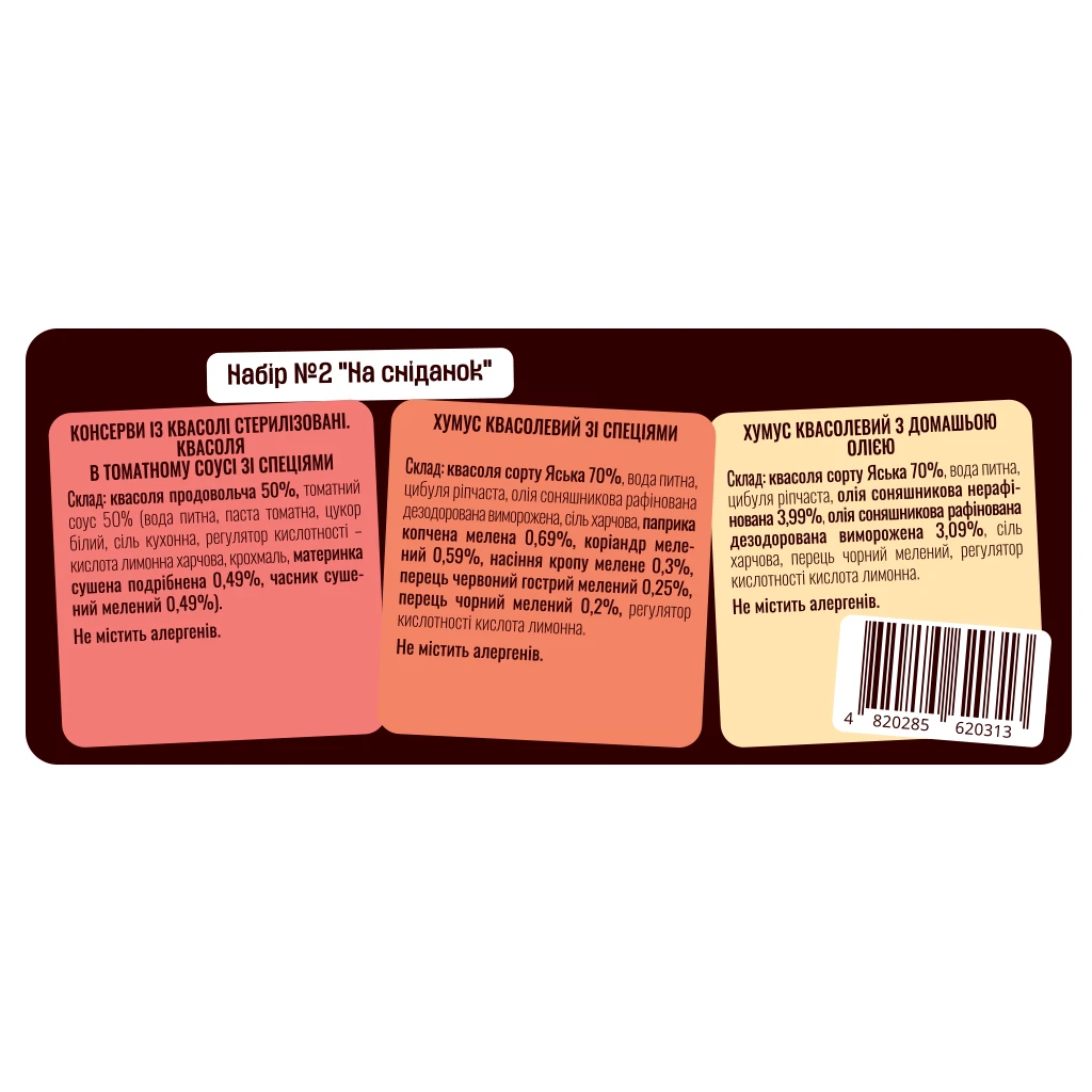 хумус квасолевий зі спеціями: квасоля сорту Яська 70%, вода питна, цибуля ріпчаста, олія соняшникова рафінована дезодорована виморожена, сіль харчова, паприка копчена мелена 0,69%, коріандр мелений 0,59%, насіння кропу мелене 0,3%, перець червоний гострий мелений 0,25%, перець чорний мелений 0,2%, регулятор кислотності кислота лимонна.
