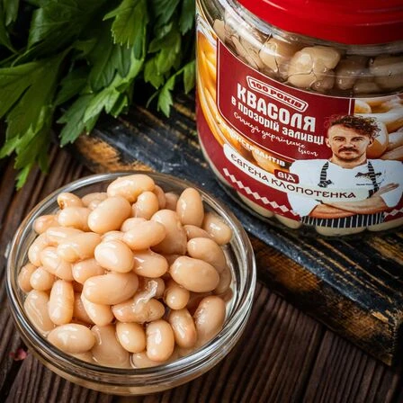 Продукт виготовляють за фірмовим рецептом Євгена Клопотенка з якісної білої квасолі, що тримає форму. Технологія приготування стандартна, спочатку замочення, потім відварювання. А завдяки різним режимах стерилізації вдалося зберегти такий апетитний та привабливий вигляд.