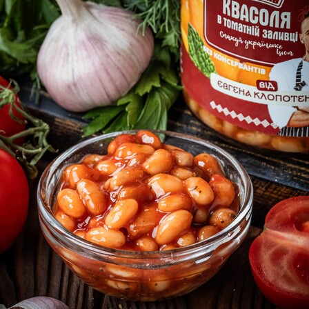 Продукт виготовляють за фірмовим рецептом Євгена Клопотенка з якісної білої квасолі, що тримає форму. Технологія приготування стандартна, спочатку замочення, потім відварювання. А завдяки різним режимах стерилізації вдалося зберегти такий апетитний та привабливий вигляд. Зі спецій обовʼязково додається часник, материнка (вона ж орегано або душниця) та, власне, томатна паста.
