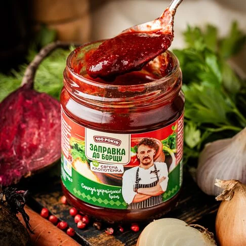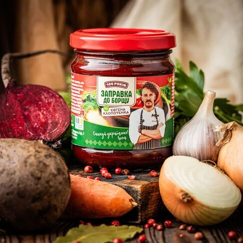 Торгова марка «100РОКІВ» виготовляє автентичні продукти та допомагає досліджувати українську кухню. Завдяки цьому звичні нам страви, як-от червоний борщ, смакують по-новому та знову й знову закохують у себе. Борщова заправка за рецептом Євгена Клопотенка дивує та інтригує водночас, створюючи унікальні поєднання продуктів. Коли б ще нам спало на думку заміксувати квашені томати, копчену грушу, ферменований рис та сушений любисток? Все це вже зроблено у зручному форматі консервації та знаходиться на відстані пари кліків на сайті «100ШОП». Ну що, гайда борщувати!