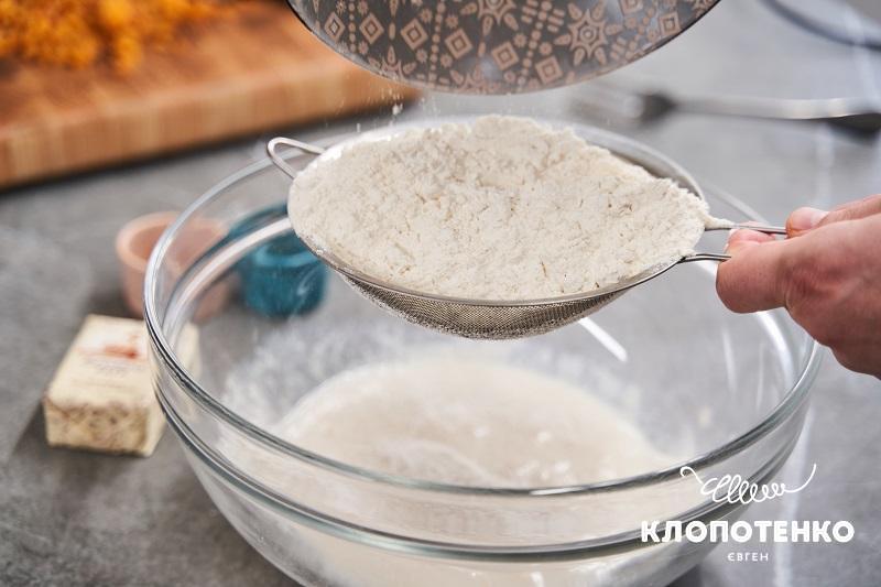 Нагрійте 120 мл молока приблизно до 36°C і вилийте в тарілку для замішування тіста. На молоко висипте 20 г розкришених пресованих дріжджів та 15 г цукру. Перемішайте та дайте їм постояти приблизно 10 хвилин. Просійте 500 г борошна.
