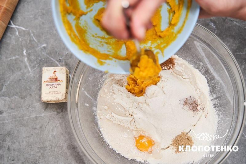 Додайте в тісто гарбузове пюре, 15 г цукру, яйце 1 ч.л. кориці, по ½ ч.л. меленого імбиру та солі, ¼ ч.л. меленого мускатного горіха та 40 г масла.