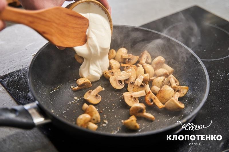 Розігрійте пательню разом із 1 ст.л. оливкової олії та обсмажте на ній печериці впродовж 5 хвилин. Додайте сіль і перець за смаком, викладіть у гриби 150 г сметани.