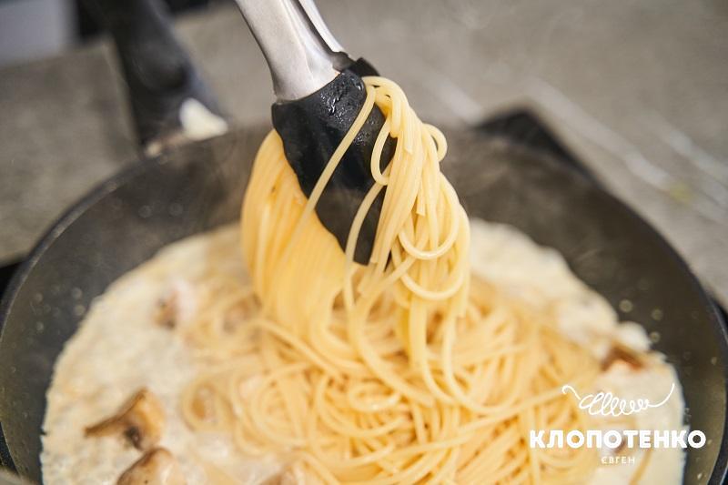 Викладіть на пательню спагеті прямо з каструлі. Найзручніше це робити щипчиками для пасти. Смажте все разом, перемішавши, 2-3 хвилини, поки соус не загусне.