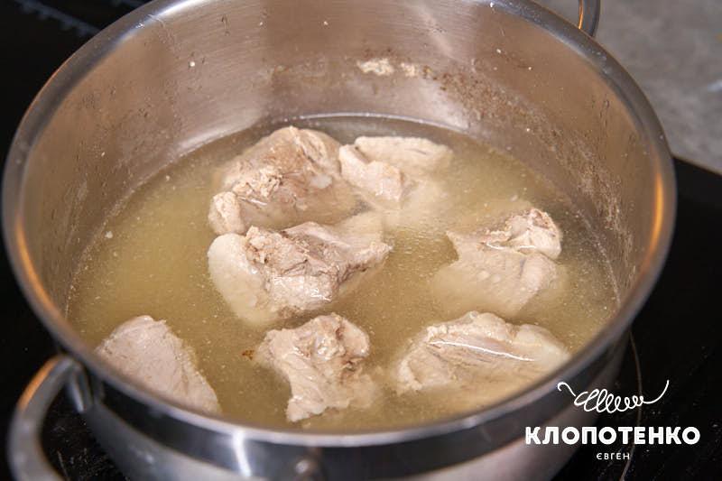Наріжте крупним кубиком 350 г свинини, перекладіть у каструлю, залийте водою, підсоліть і відваріть до готовності впродовж 40 хвилин.