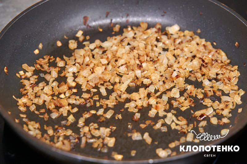 Одну цибулину наріжте дрібним кубиком, іншу – півкільцями. Спершу до золотавого кольору обсмажте на розігрітій з олією пательні цибулю кубиком, перекладіть її в миску. Потім так само до золотавості обсмажте цибулю півкільцями та відставте.