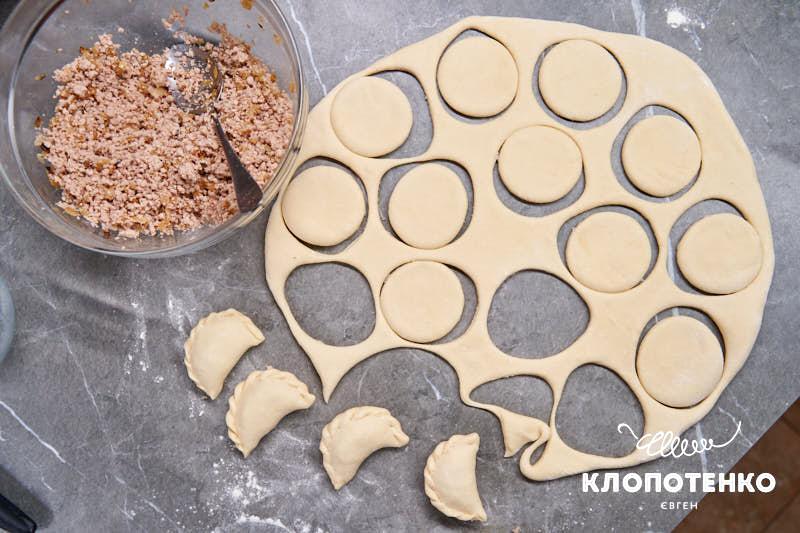 Розкачайте тісто товщиною приблизно в 0,5 мм, склянкою чи формою видавіть кружальця. Сформуйте вареники, викладаючи всередину начинку (кількість залежить від розміру ваших вареників – від 1 ч.л. до ст.л.) та ретельно защипуючи краї.