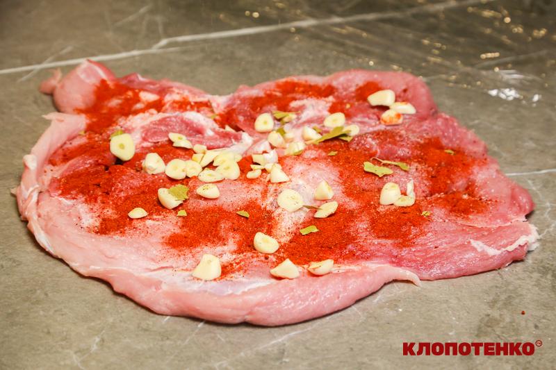 Натріть м'ясо 1 ч. л. солі та 1 ч. л. солодкої паприки. Зверху додайте шматочки часнику, а також 1 подрібнений лавровий листок. Поставте м'ясо маринуватися до холодильника на 3-4 год.
