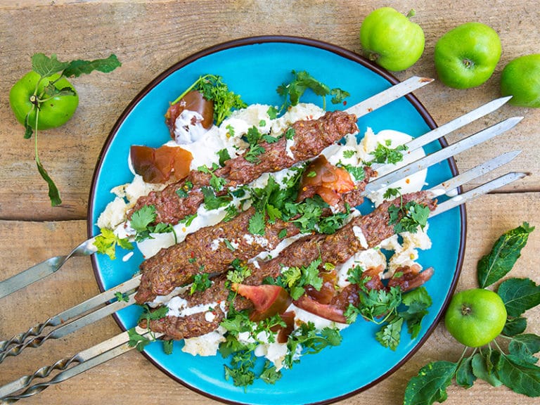 Щоб у вас вийшов смачний кебаб з яловичини, необхідно дотримуватися простих правил. По-перше, краще зробіть фарш самі, щоб бути впевненими в його якості, але сильно не перемелюйте. По-друге, його не варто відбивати, як ви це зазвичай робите на котлети, а лише гарно перемішати, щоб всі інгредієнти рівномірно розподілилися. По-третє, вам потрібні пласкі широкі шампури – саме на таких кебаб добре тримається та не розпадається. Як не маєте таких, готуйте на решітці. Готовий кебаб подавайте із лавашем та різноманітними овочами та зеленню. Смакота на природі!
