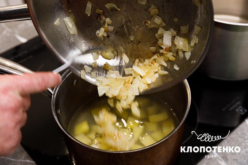 Очистьте цибулину, дрібно її наріжте. Розтопіть на пательні 20 г масла та обсмажте на ньому цибулю до золотистого кольору - приблизно 6-8 хвилин. Додайте цибулю в суп.
