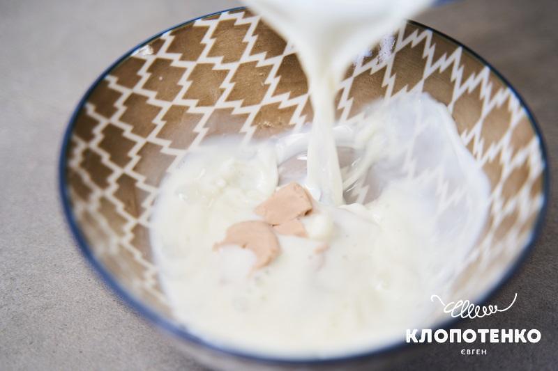 За пару годин до приготування дістаньте з холодильника яйце та 30 г масла, щоб вони нагрілися до кімнатної температури. Розігрійте 200 мл молока до 36 градусів. Температура має бути комфортною, якщо крапнути трішки на тильну сторону долоні. Це потрібно, щоб дріжджі правильно спрацювали: у холодному молоці вони не активуються, а в гарячому – помруть. Додайте в молоко 10 г дріжджів та 10 г цукру. Розмішайте, щоб усе розчинилося.