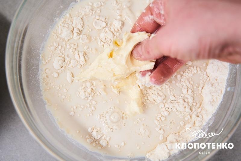 Окремо збийте яйце кімнатної температури. У дріжджову суміш поступово всипте 350 г борошна. Потім розімніть м’яке масло руками та вмішайте його в основу для тіста разом із дрібкою солі.