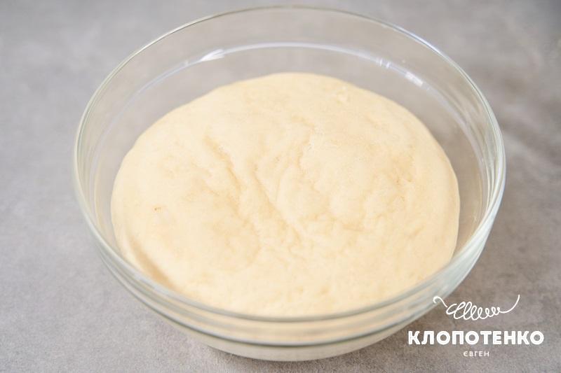 Готове тісто перекладіть у велику миску, бо воно буде підійматися, накрийте рушником та поставте підходити в теплому місці впродовж 1 години.