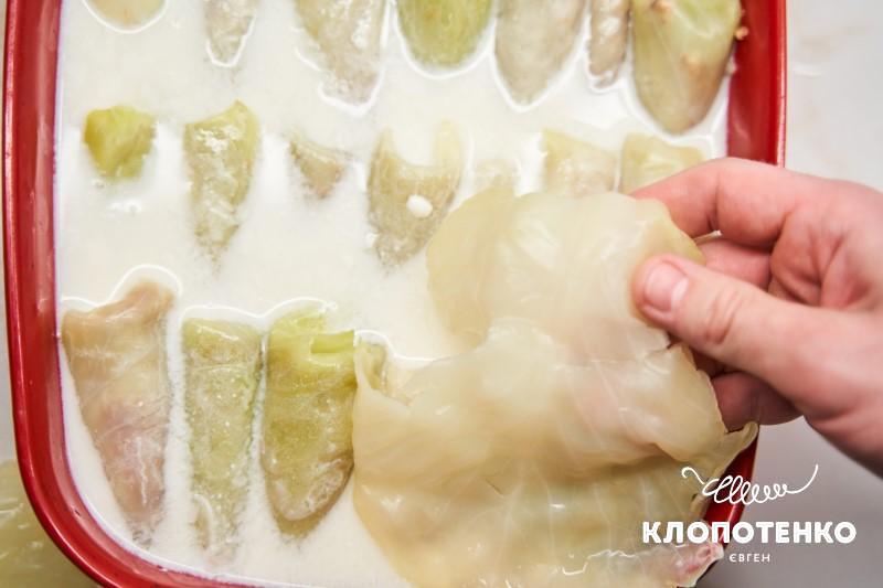 Змішайте 500 мл відвару капусти, зі 150-200 мл сметани, додайте 2 лаврових листочки, 3 горошини духмяного перцю, сіль до смаку. Вилийте у форму з голубцями і накрийте листям капусти. Готуйте 1 годину при температурі 200-220 градусів. Подавайте гарячими зі сметаною, або сметанно-часниковим соусом.