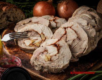 Соковитий рулет готується у власному соку зі спеціями. М’ясо маринують із часником і паприкою, щільно загортають у харчову плівку і відварюють на слабкому вогні. Після охолодження він добре тримає форму та підходить для нарізки і великоднього кошика.