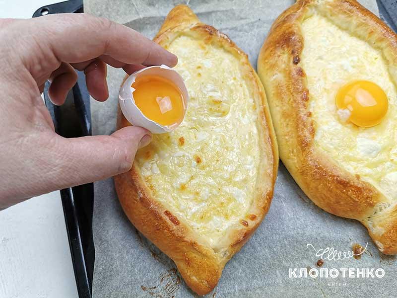 Дістаньте рум'яні хачапурі та в кожен з «човників» вбийте по 1 жовтку. Знову поверніть в духовку на 1-2 хвилини, щоб жовток прогрівся і зовсім трошки прихопився, і відразу ж виймайте. Подавайте, притрусивши свіжомеленим перцем.