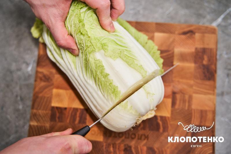 Готуючи будь-які голубці, вам потрібно акуратно відділити кожен листочок капусти. Просто розбираючи її, листя можна пошкодити. Тому тут ми обріжемо весь низ пекінської капусти на кілька сантиметрів, та легко розберемо кожен листочок.